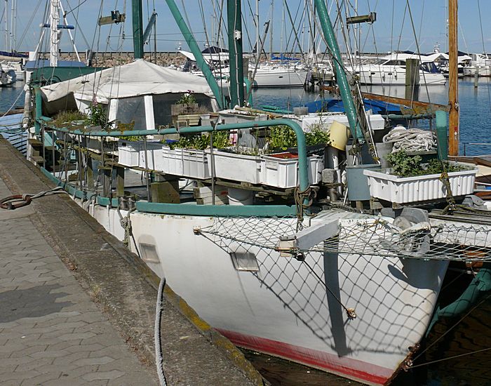 Aber nun scheint es ihnen schlecht zu gehen oder sie leben nicht mehr . Das Grünzeug kämpft ums Überleben. Das sicher unverkäufliche Schiff ist hier in einen Winkel des Hafens verschoben worden.